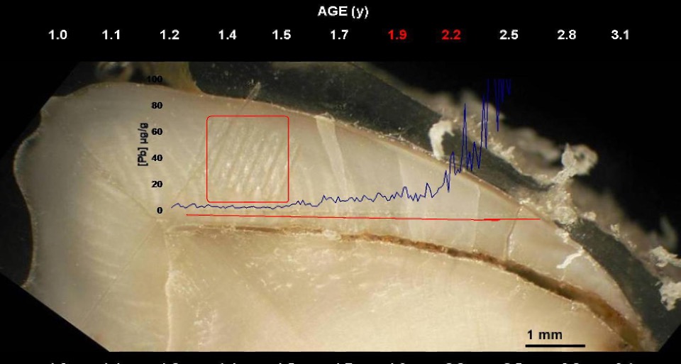 A cut molar. The red line follows the path of a laser. The numbers at the top correspond to ages at development, and the blue line is the amount of lead found in the enamel. The pattern suggests that lead increased around two years of age, possibly related to the introduction of weaning foods,